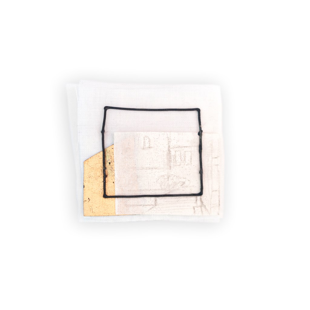 Brooch mixed media on fabric, constructed Textile, gesso,.925 metal point drawing, gold leafiron, cooper, powder coating,stainless steel6 x 6.7 x .3 cm