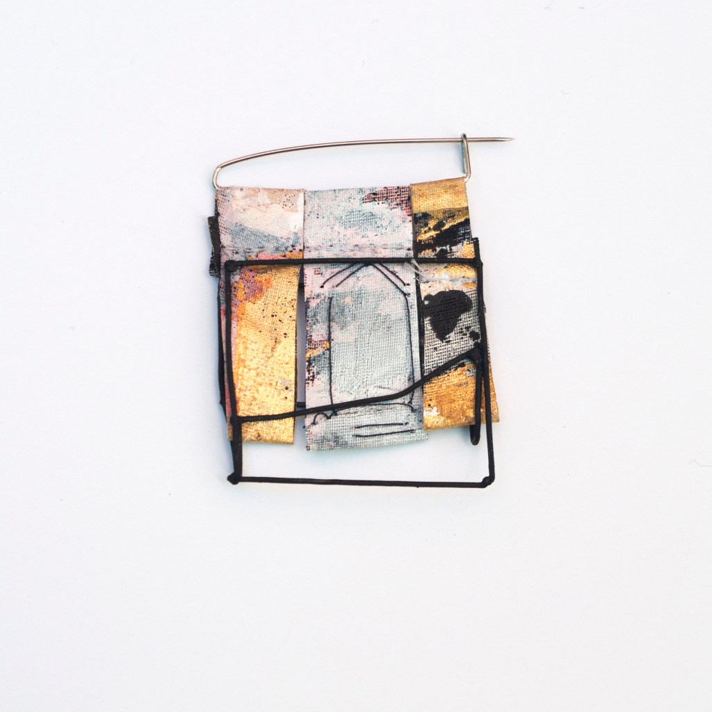 Brooch mixed media on fabric,constructed Textile, gesso, acrylic paint, gold leaf Watercolor, iron, cooper, powder coating,stainless steel4.5 x9.5 x 1 cm