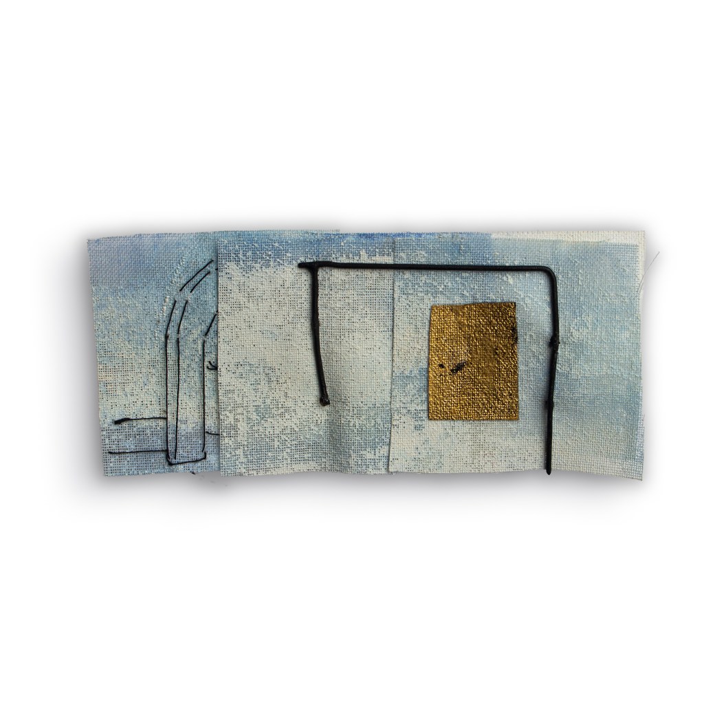 Brooch mixed media on fabric, constructed Textile, gesso, acrylic paint, gold leaf, polyester threadWatercolor, iron, stainless steel6 x4.5 x.3 cm