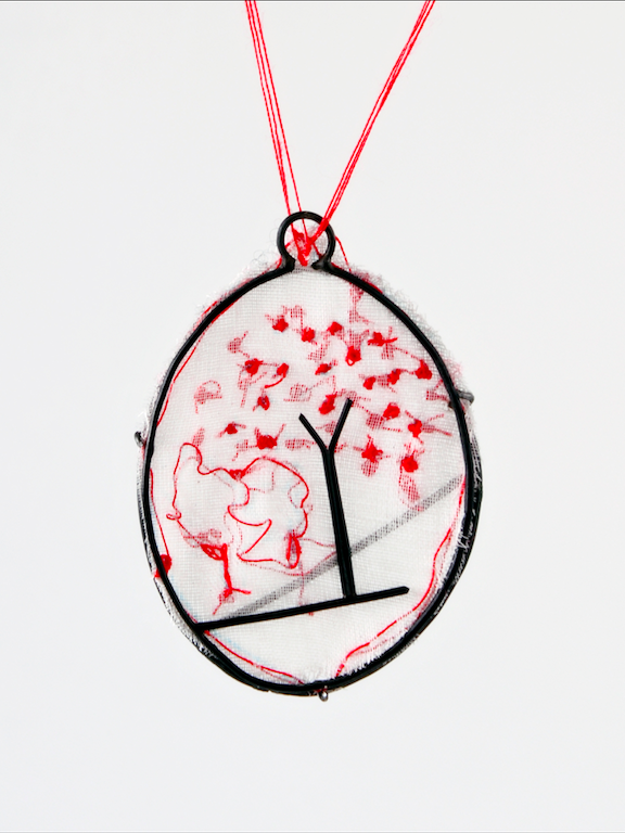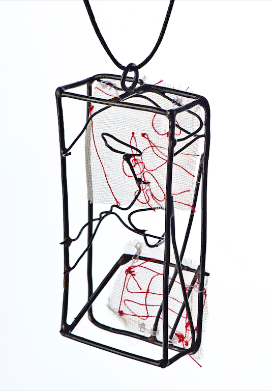 Constructed pendant, Iron, Textile, Polyester thread, Waxed cotton cord. 5 x 3 x 1cm . 2016