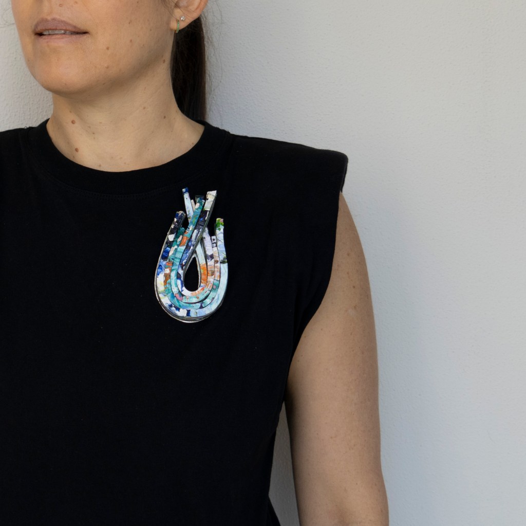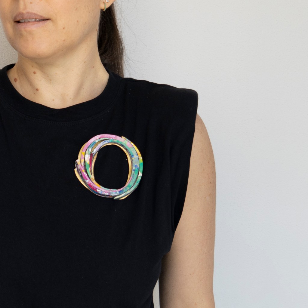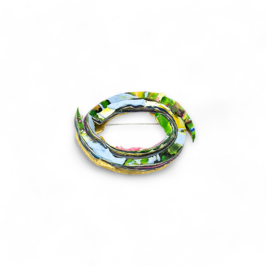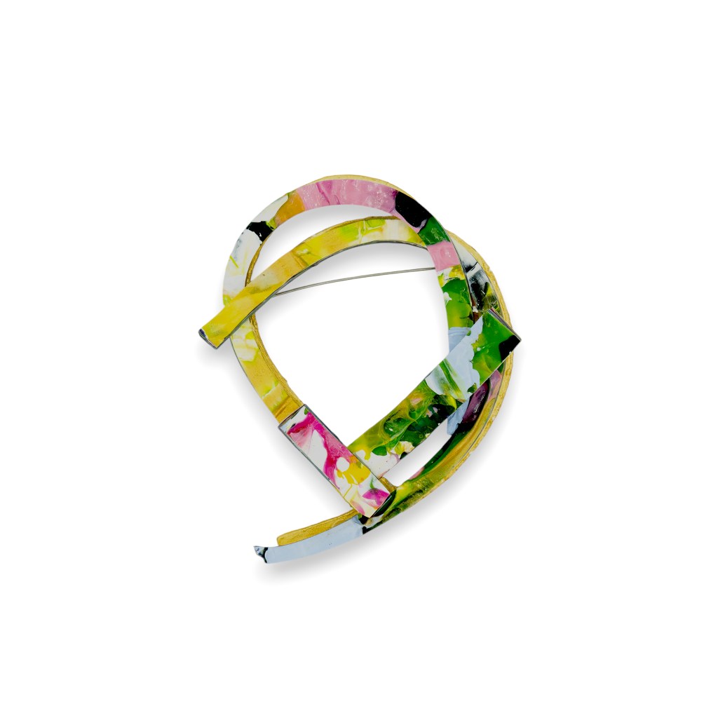 Acrylic paint, Brass, gold leaf, white metal findings stainless steel