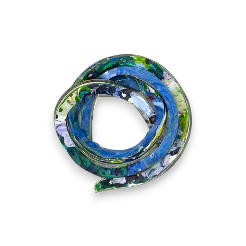 Acrylic Paint, Impasto, brass, gesso, gold leaf, white metal findings, stainless steel.