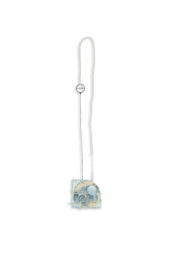 Windows (Paris) III 2021 6.5 x 7.5 x 1.5 cm Textile, watercolour, pencil, silk thread, fresh water pearls, stainless steelWindows (Paris) II 2021 57 x 9 x 2 cm Textile, gesso, watercolour, pencil, polyester thread Iron Cooper, enamel, reflecting beads waxed cotton cord, Silk cord, fresh water pearls